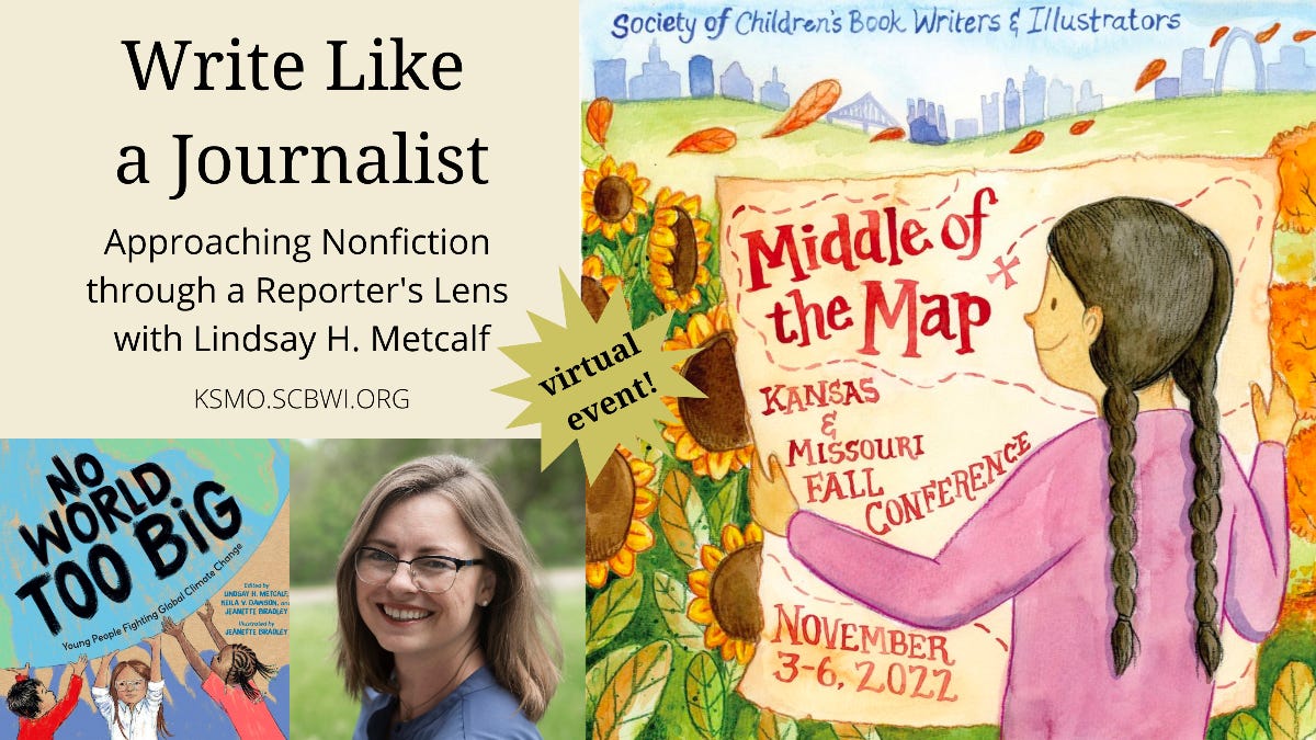 Nov 5 at 2:15 Central (virtual) - Lindsay Metcalf will present "Write Like a Journalist" at the KS/MO SCBWI virtual fall conference. Learn more and register here.