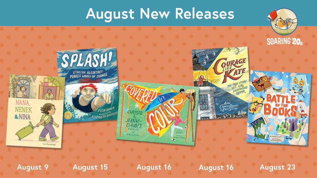 There's a little something for everyone this month. Find real stories of everyday courage in SPLASH! (Boxer), COVERED IN COLOR (Boxer), and COURAGE LIKE KATE (Redding). Celebrate summertime visits with grandparents in NANA, NENEK & NINA (Ferneyhough). Or usher in back-to-school season with BATTLE OF THE BOOKS (Ellsworth).