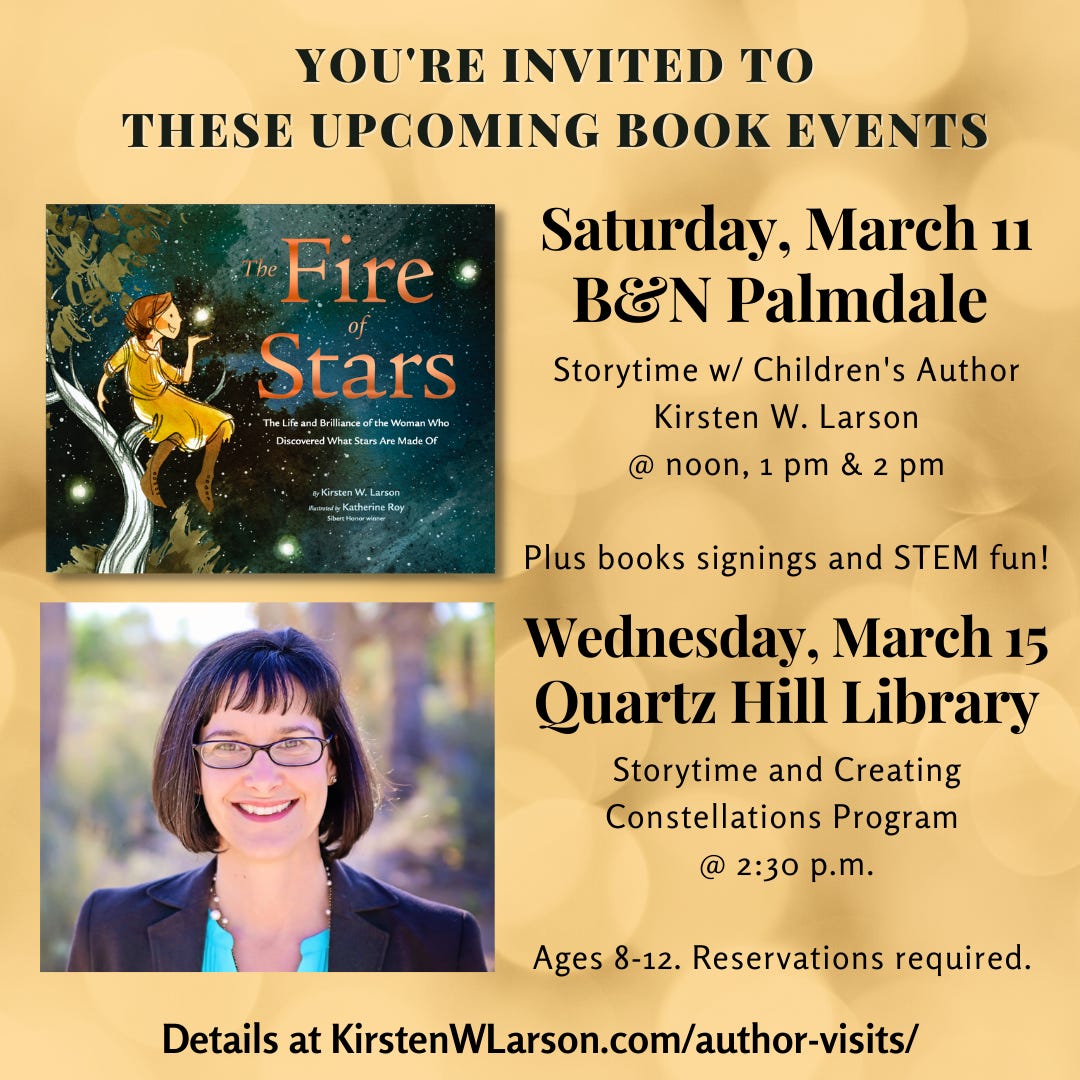 Mar. 11 @ noon Pacific- FIRE OF STARS launch party at Barnes & Noble Palmdale (in person). Join Kirsten for a celebration of her latest book, THE FIRE OF STARS, including story times and book signing. Get details here.